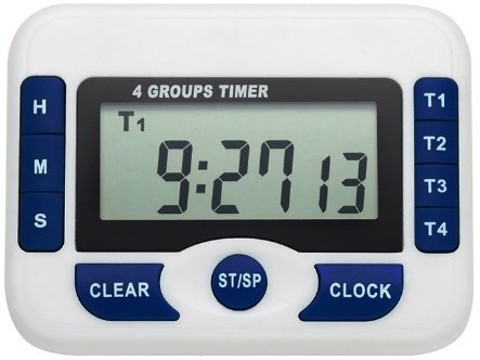Timer, temporizador de cuatro tiempos, pueden trabajar de forma simultánea, cuenta con temporizador de cuenta regresiva y cronometro. Cada canal cuenta con su propio sonido de alarma.